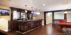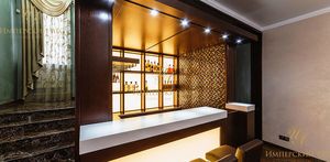 - Пристенный витринный модуль, шкаф за барменом. Состоит из тумбы с раздвижными или распашными дверцами, столешницы для размещения встраиваемого или настольного оборудования и витринной части.
