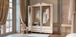 - Шкаф для хранения одежды. Он может быть разделен на несколько отсеков или секций. По желанию клиента конструкция дополняется выдвижными ящиками и полками. Может быть произведён с использованием комбинированных пород дерева.